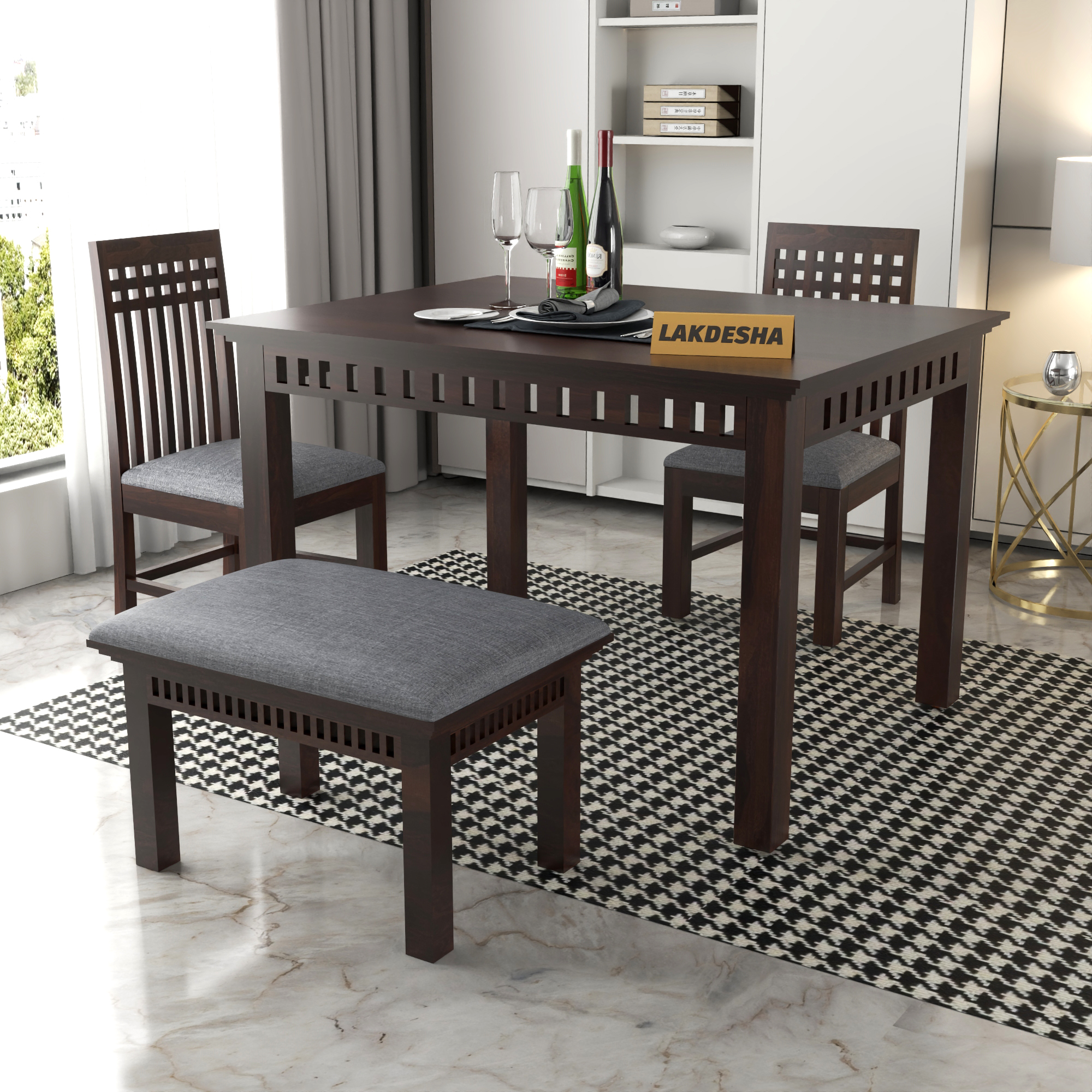 The natural wood finish highlights the rich grain patterns of Sheesham wood, adding warmth and a premium look to your interiors. The combination of chairs and bench offers flexible seating options, making it ideal for both everyday meals and family gatherings while optimizing space efficiently.
