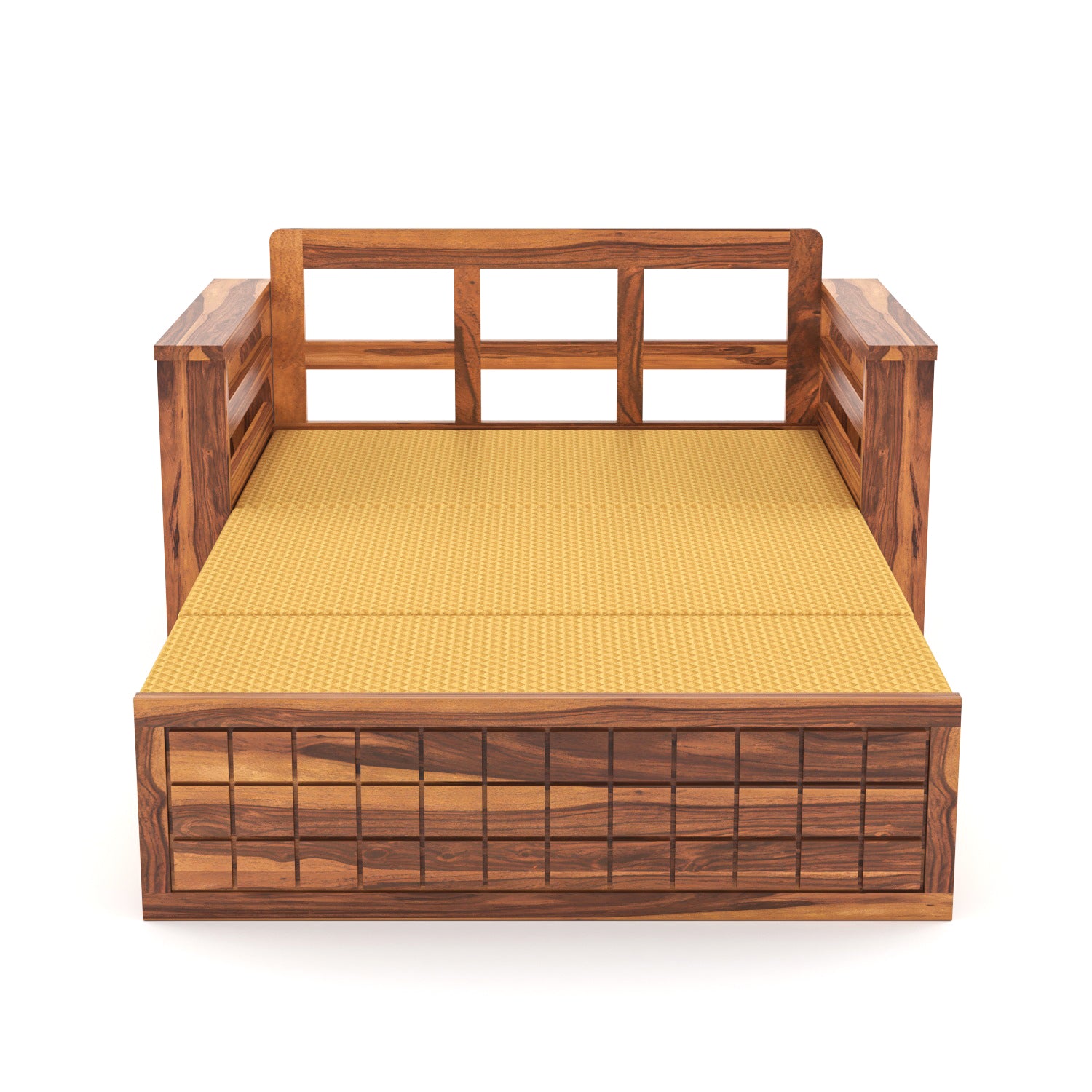 The honey finish beautifully showcases the natural grains of Sheesham wood, adding warmth and sophistication to your interior décor. Its sturdy wooden frame ensures reliability, while the thoughtfully designed seating provides ergonomic comfort. Effortlessly switch between a cozy sofa and a comfortable bed to suit your daily needs or unexpected guests.