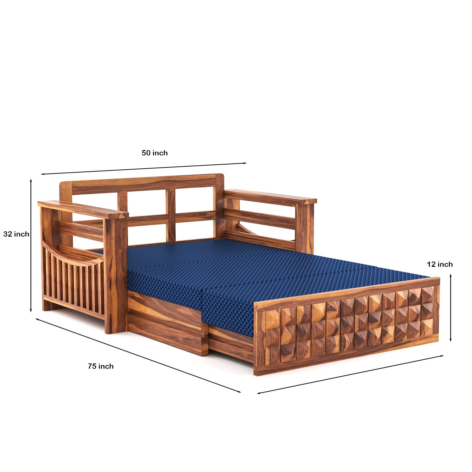 The honey finish highlights the natural grain of Sheesham wood, adding warmth and sophistication to any decor. Its diamond-patterned backrest exudes contemporary charm, while the sturdy wooden frame ensures robust support and longevity. Comfortable seating and easy conversion make it an ideal solution for relaxation, lounging, or accommodating overnight guests.