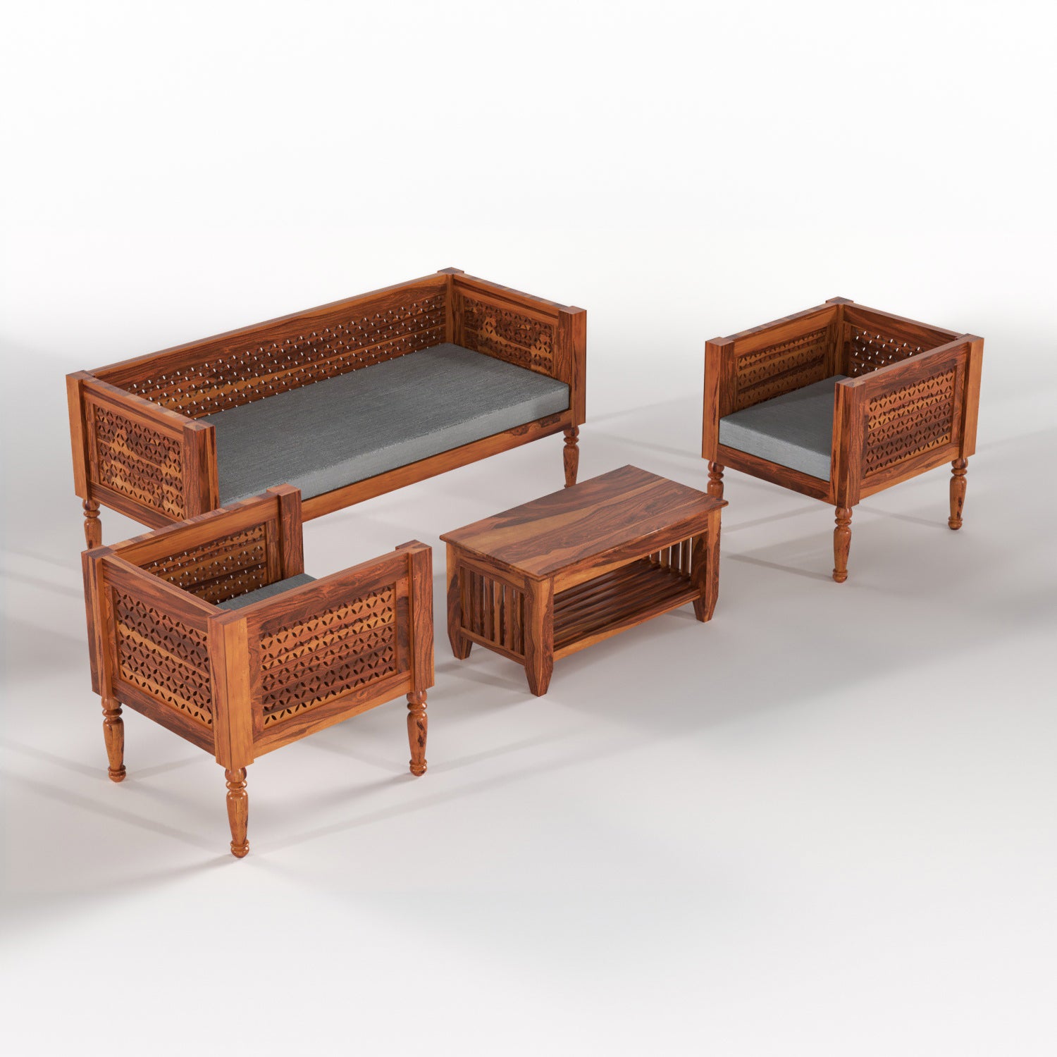 Designed to comfortably seat five people, this set includes a spacious 3-seater and two single chairs, paired with cushioned seating for maximum comfort during long conversations, family gatherings, or casual relaxation. Its sturdy wooden frame ensures long-lasting performance, while the sleek design adds a refined touch to modern as well as traditional interiors.
